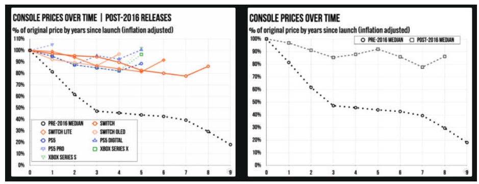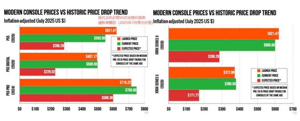分析指出,如果算上通脹,現在的遊戲主機並非遊戲行業史上最昂貴的。像雅達利2600、Intellivision、Neo Geo和3DO等主機,如果按照2025年貨幣價值,首發價格都遠超1000美元。更近的例子如PS3(按2025年美元計算首發價爲949.50美元)和Xbox One(689.29美元),其價格都顯著高於如今主流主機300至600美元的價格區間。