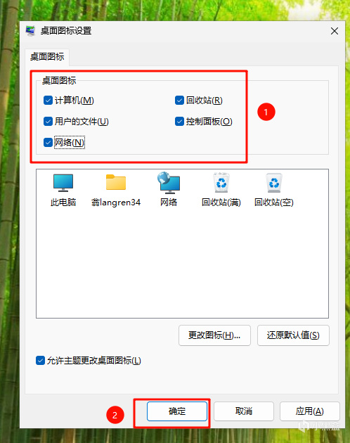可批量勾选需要显示的图标,包括"此电脑"、"控制面板"、"网络"等