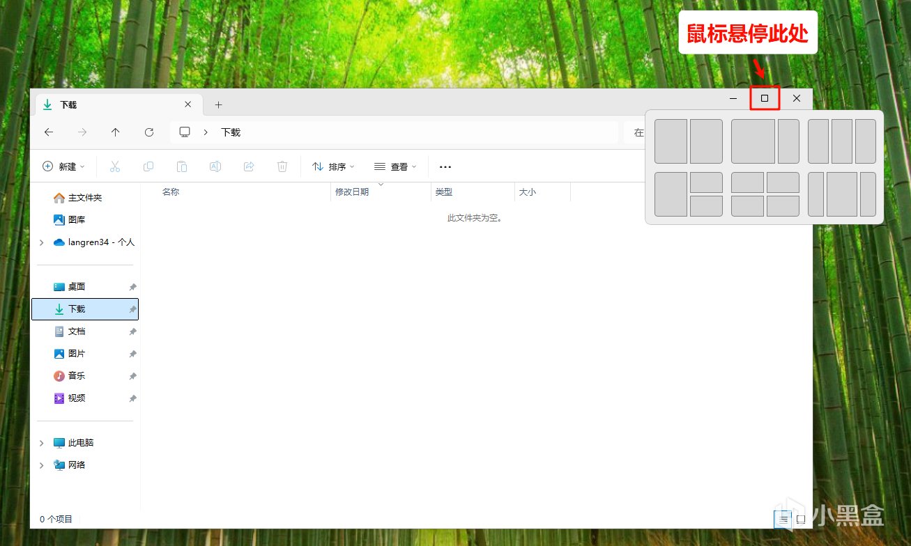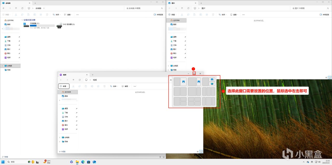 将鼠标悬停在任何窗口的“最大化”按钮上,系统会智能推荐多种分屏布局。