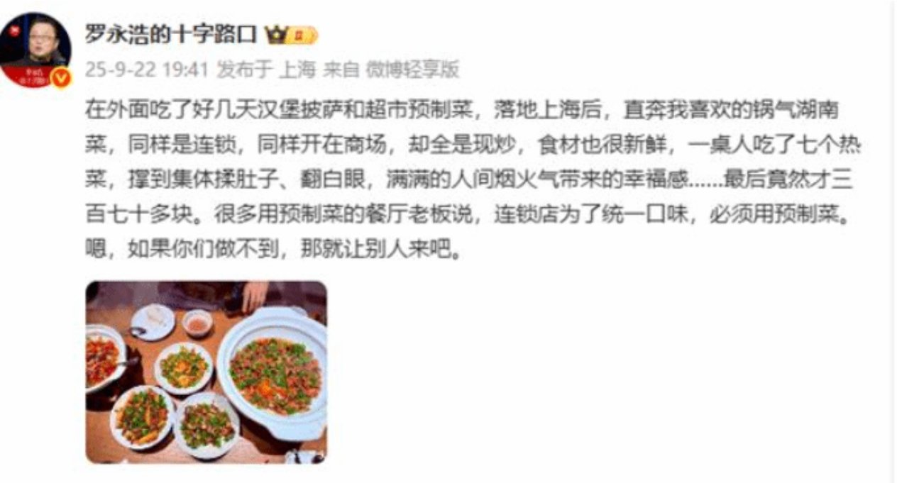 剛落地上海的羅永浩避開快餐與預製菜,選擇一家商場內的湖南菜連鎖店。該店雖爲連鎖經營,但堅持全菜品明火現炒且食材新鮮。七道熱菜共消費370餘元,其高性價比和“鍋氣”體驗被羅永浩贊爲“真正的人間煙火”。他直接批評部分連鎖餐廳以“統一口味”爲由強制推行預製菜的做法,稱:“如果你們做不到(現炒),那就讓別人來吧。”