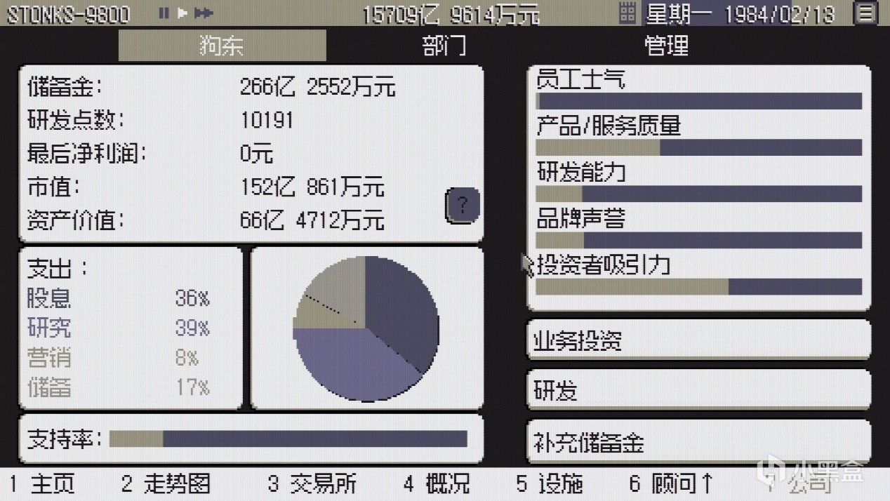 炒股作为本作的核心玩法,没有现实股票交易市场那样的复杂操作,你无需观察K线的反转形态、持续形态等预测接下来的走势,无需通过MACD、KDJ、成交量等各种技术指标判断方向,也无需认真剖析每个公司的估值、护城河、盈利能力等基本面。