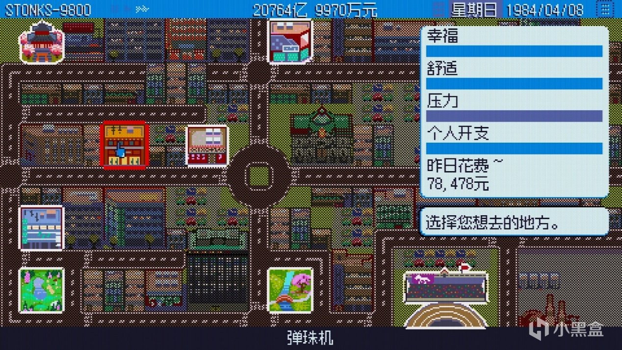 除了股市交易以外,玩家还需要注意自身的幸福、舒适和压力值,压力值爆表可能会导致住院,因此外出是必不可少的。和朋友一起在公园散步,或是酒馆喝酒能够快速降低压力。此外还有各种有意思的小游戏,比如钓鱼、扭蛋、赌马、弹珠、打飞机以及高尔夫等。