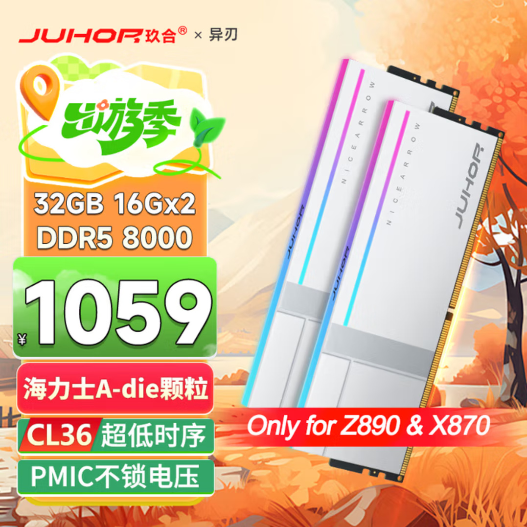 JUHOR玖合異刃系列內存條,專爲INTEL Z890及AMD X870高端主板而設定,8000MHz高頻,時序CL36-48-48-126,原廠海力士A-die明星顆粒,搭配旗艦CPU,頻率破9000MHz也不是不可能。