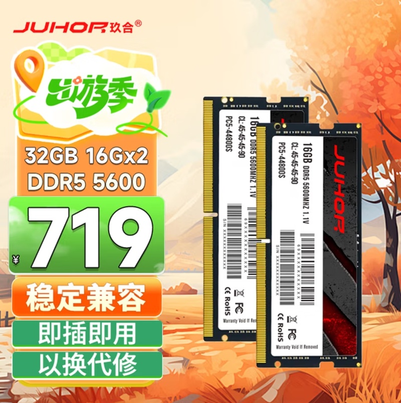 JUHOR玖合这款5600MHz的笔记本内存条,单根容量为16G,CL45-45-45-90,电压仅仅1.1V,262-Pin SO-DIMM,兼容市面上所有笔记本内存插槽,大家兼容性无需担心。