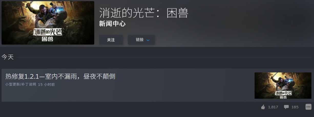 遊戲目前 Steam 總體評價“多半好評”,或許由於一些 BUG(比如室內下雨)因素影響了玩家體驗,不過目前這個 BUG 已經被官方火速修復。“戰鬥+跑酷+收集+養成+開放世界”五大要素有機串聯的閉環設計,構成了《消逝的光芒:困獸》獨具特色的遊玩節奏,讓每一次冒險都充滿變數與成就感。最後推薦大家找機會入手一波,十一期間殺穿河狸谷!