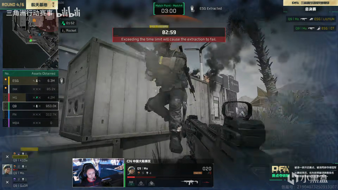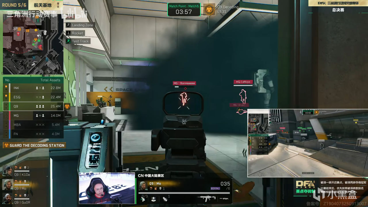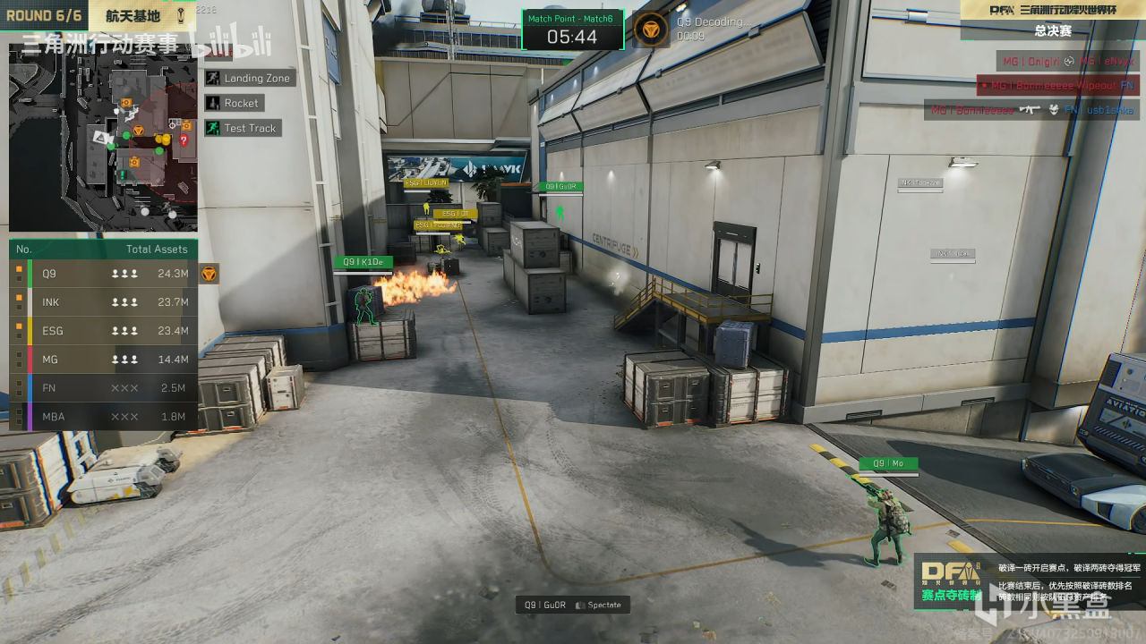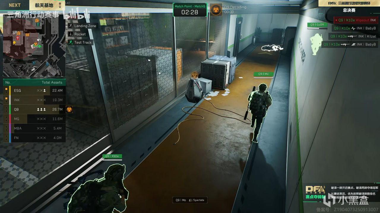 就在ESG拿砖的瞬间,被Q9.Mo抓住机会爆头。随后Q9抓住战机,打掉ESG两名干员,又将欲来抢砖的MG全员淘汰。