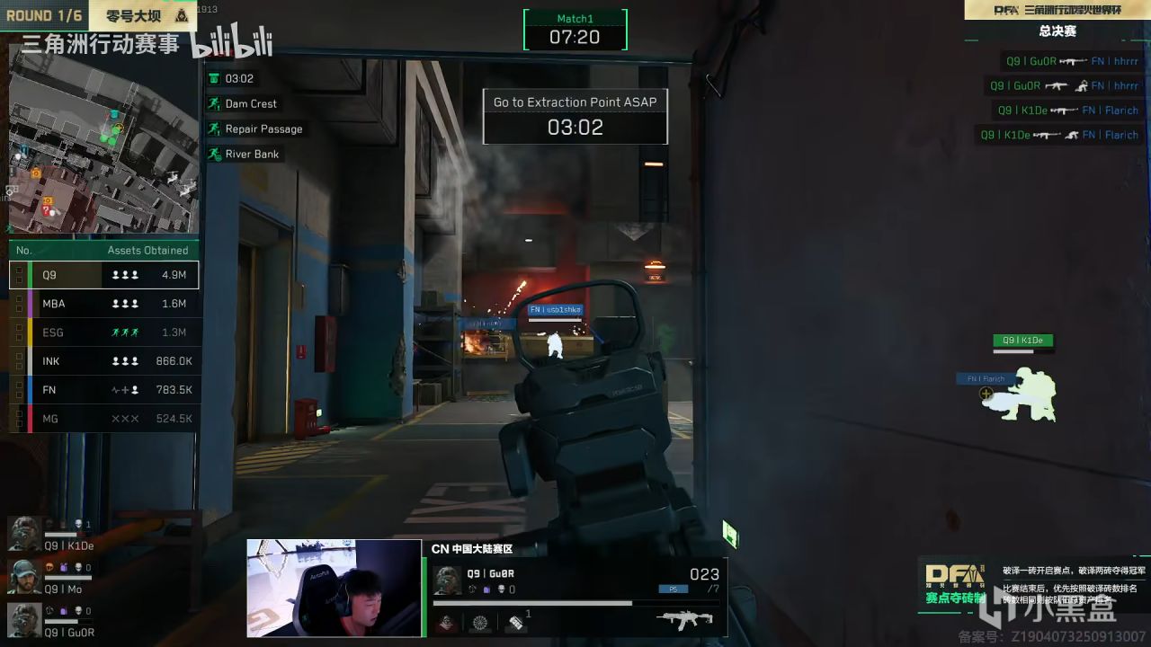 Q9前往撤离点撤离,遇上FN全队,Q9.GuoR凭借精湛的枪法给团队带来巨大优势,最终Q9灭队FN并顺利全员撤离。