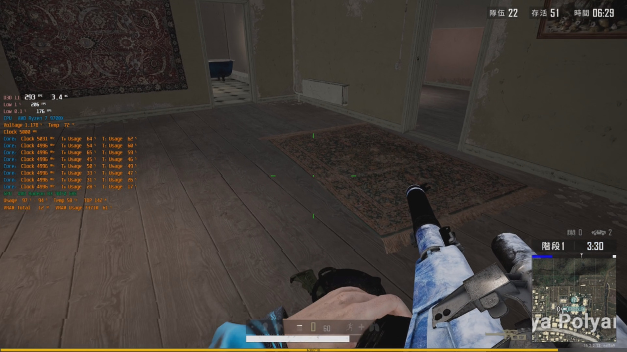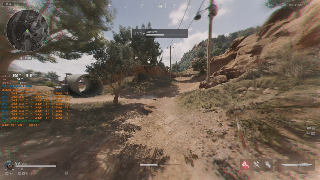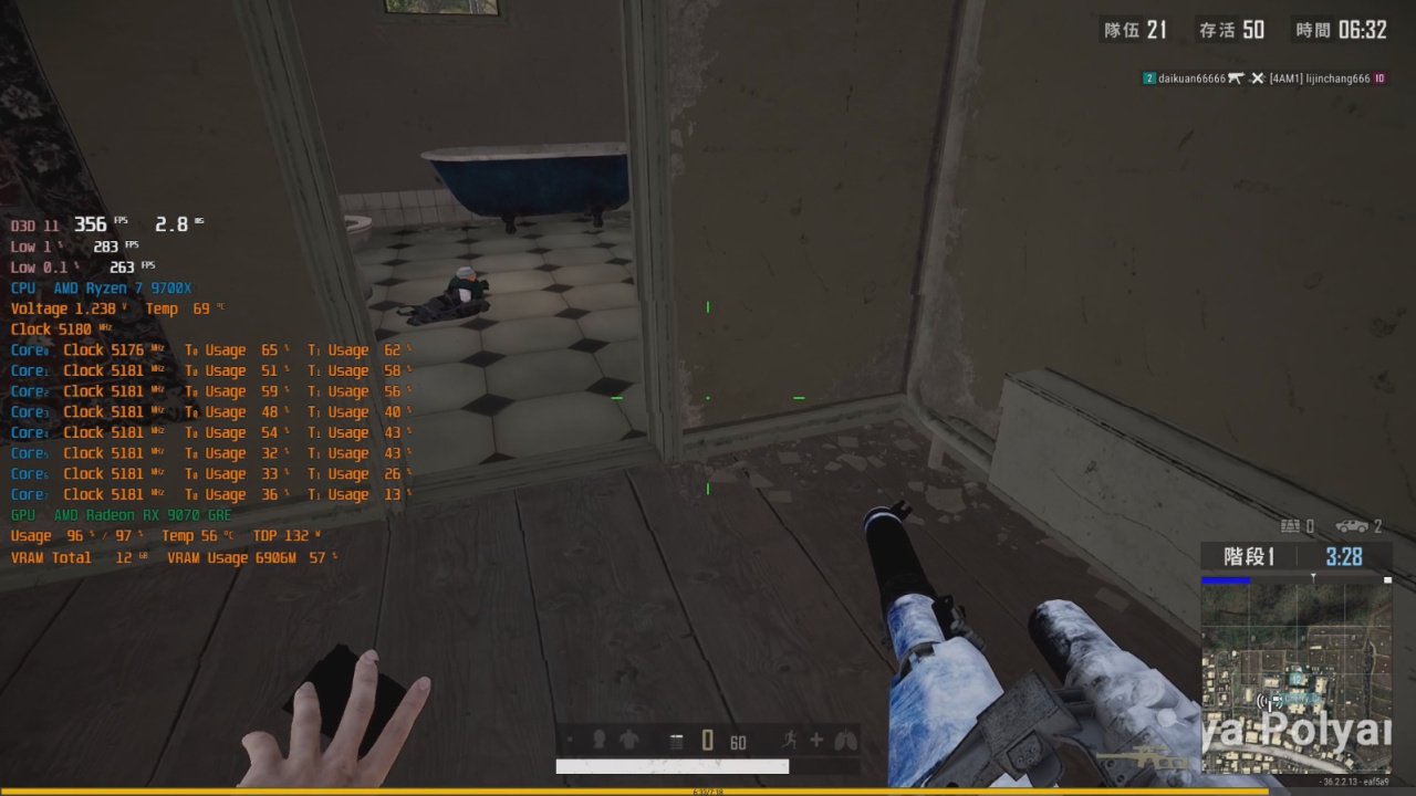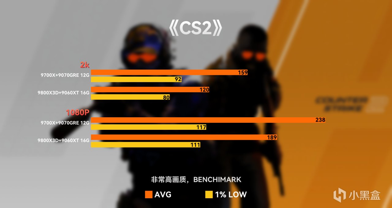 《CS2》2K 非常高画质中,9800x3d+9060xt 分辨率下画面细节更清晰,配置的高帧表现确保 “远距离瞄准”“多人混战” 时的流畅度,兼顾画质与竞技性。9700x+9070gre在复杂战斗场景可能出现卡顿,影响操作连贯性。