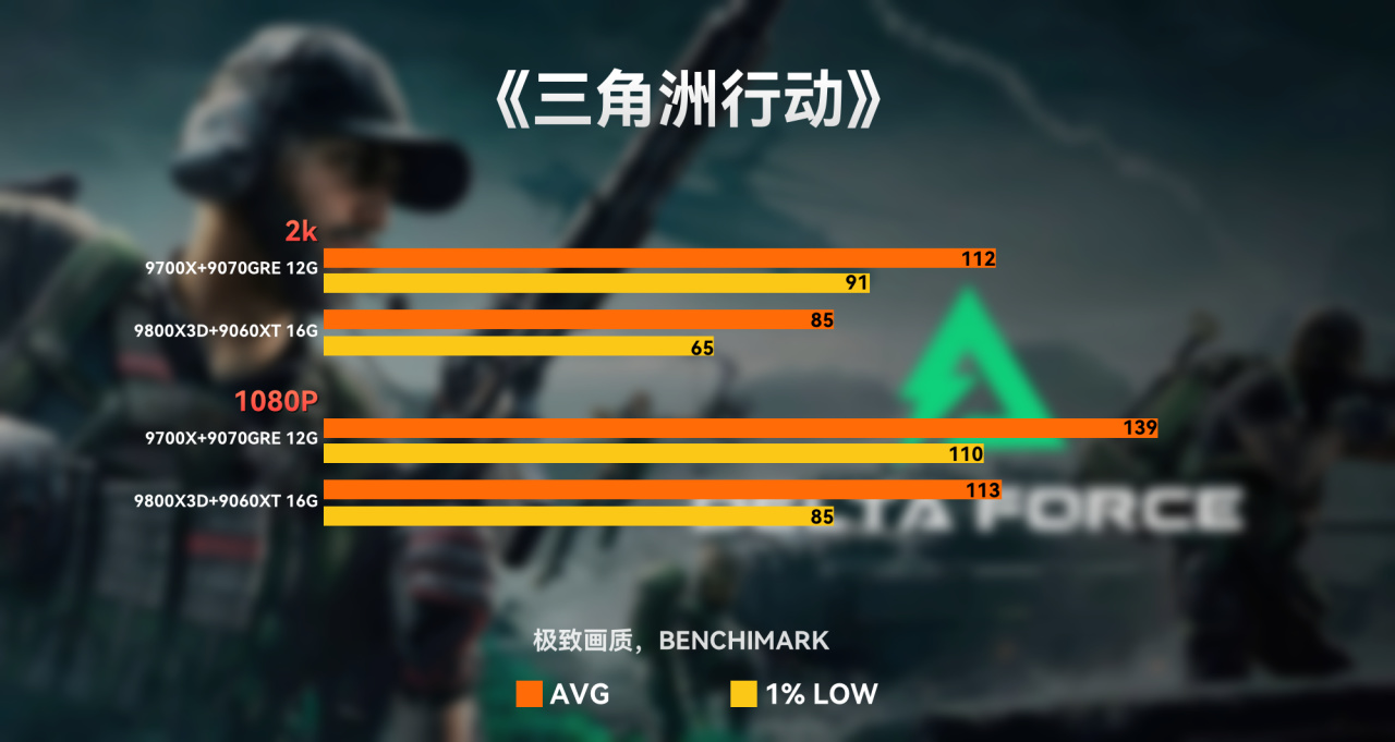 《三角洲行动》1080P 极致画质(FSR 未开启)下,这套 CPU 与显卡在 “密集枪战”“转点” 场景中表现出色,高平均帧与 1% 低帧让操作响应无延迟,适合硬核竞技玩家。另一套配置双帧数据落后于推荐配置,但该套 CPU 与显卡仍能保证基本流畅度,适合对极致对抗需求较低的玩家。