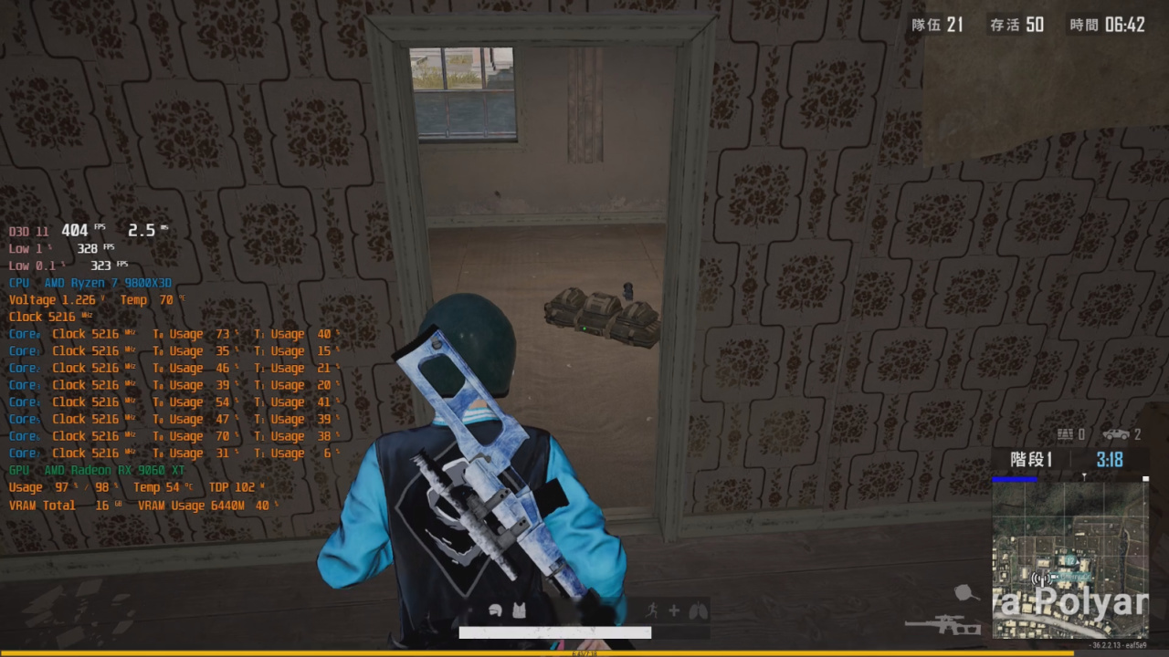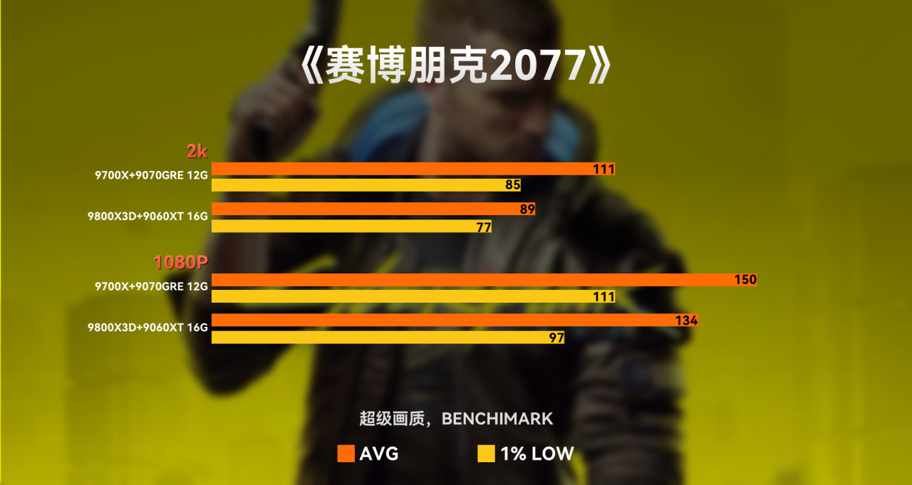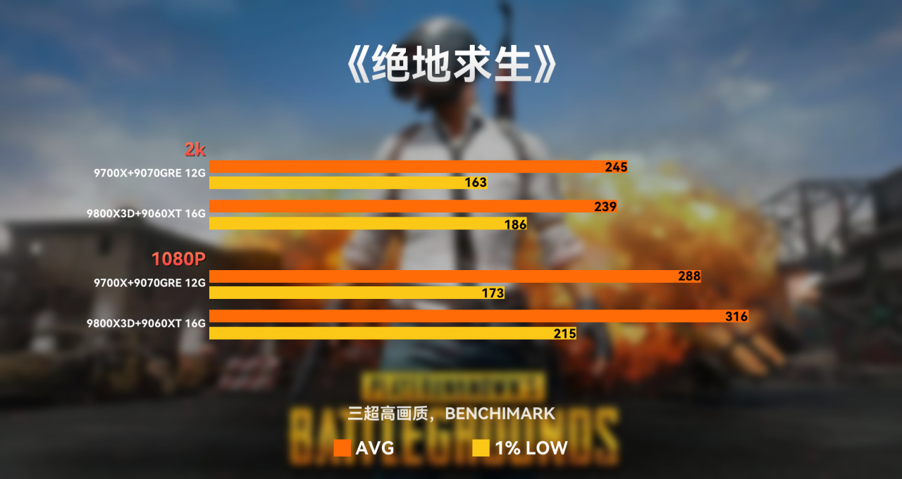 • 大逃杀类游戏对 CPU 缓存敏感,1080P/2K 场景中 R7 9800X3D + RX9060XT 16G 的低帧优势更突出;