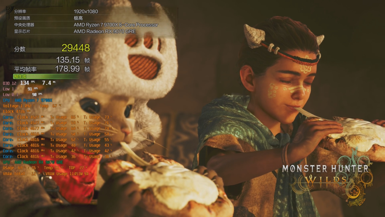 《怪物猎人:荒野》1080p极高画质下,这套 CPU 与显卡的高 1% 低帧让 “怪物狂暴攻击”“多人协作狩猎” 时连招更流畅。另一套配置平均帧相同,但 1% 低帧稍低,该套 CPU 与显卡在怪物狂暴等复杂战斗场景可能出现轻微卡顿,影响连招流畅度。这款游戏很吃显存,所以9060xt的16G显存也占据优势,12G显存的9070GRE会出现显存吃紧的情况。