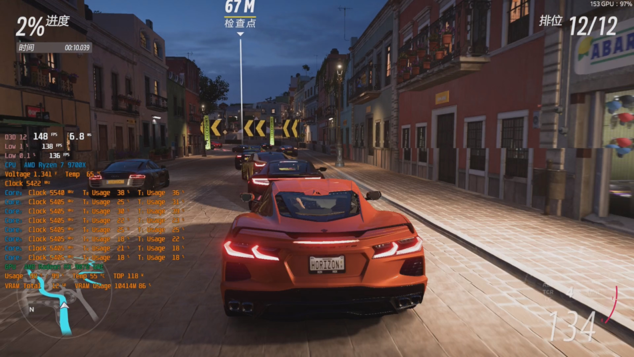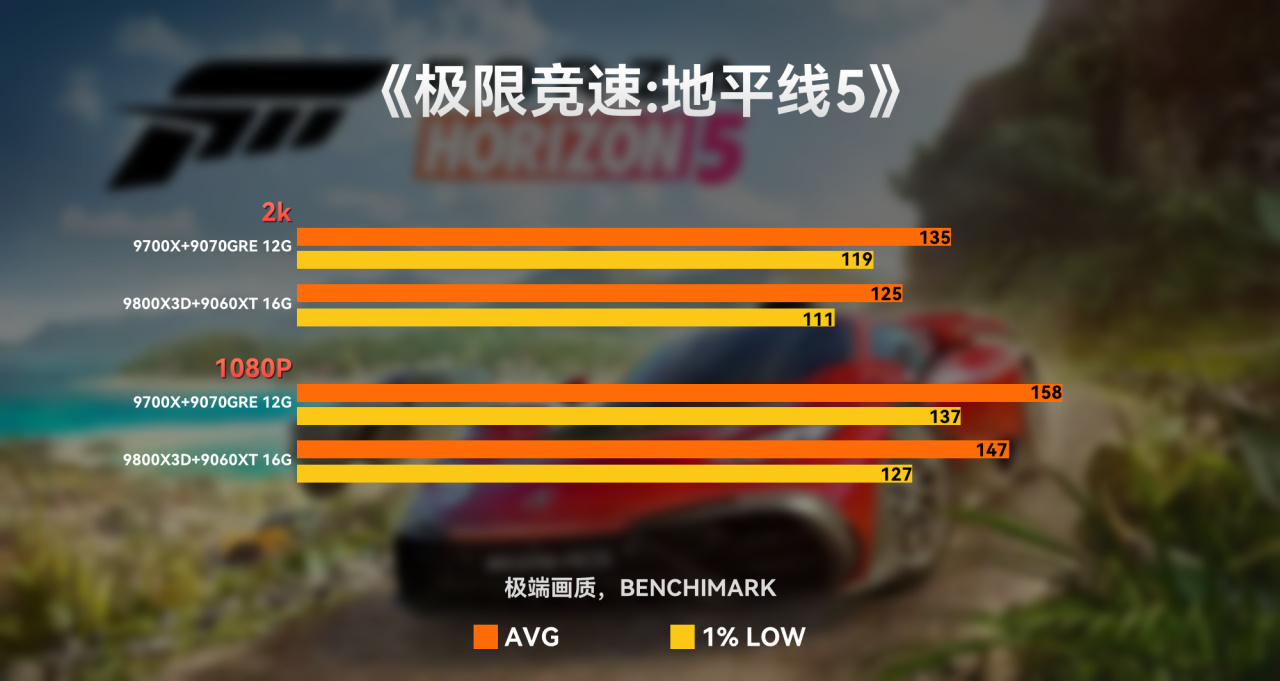 《极限竞速:地平线 5》1080P 极端画质下,这套 CPU 与显卡带来的高 1% 低帧保证 “高速行驶 + 地形突变” 时的操作精准度。另一套配置双帧数据稍低,该套 CPU 与显卡在高速过弯等场景操作跟手性略逊,但仍能满足基本竞速需求。