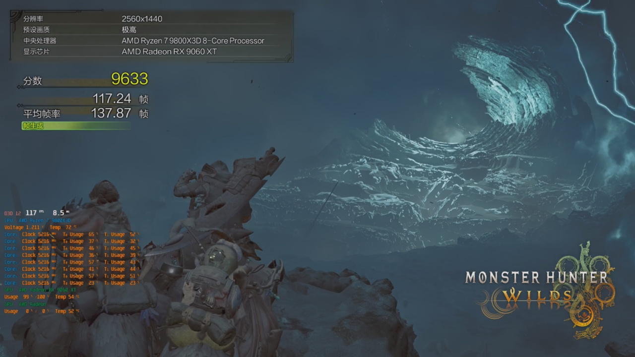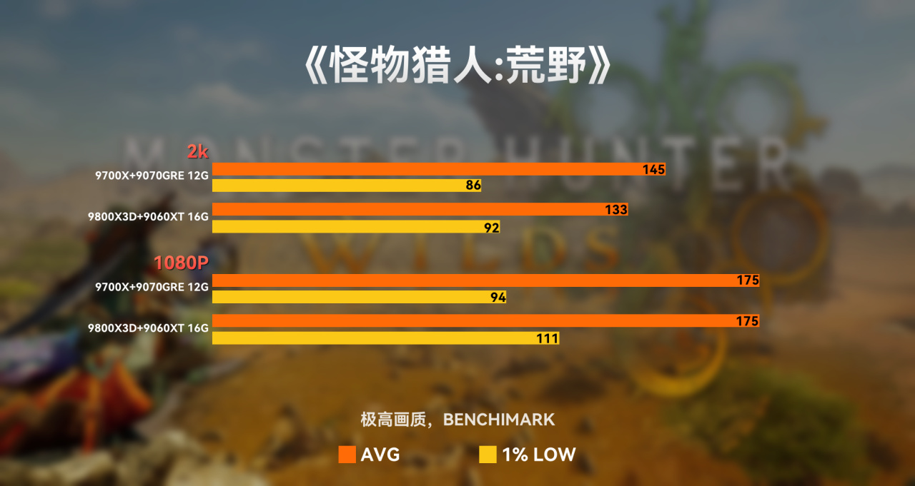 《怪物猎人:荒野》2k极高画质下,这套 CPU 与显卡的 1% 低帧优势确保 “大型怪物战斗” 时的操作连贯性。另一套配置平均帧稍高,但 1% 低帧较低,该套 CPU 与显卡在大型怪物战斗场景可能出现卡顿,影响操作连贯性。这也说明了12G显存的9070GRE爆显存了,那么怪猎这款游戏建议还是选用大显存的显卡。