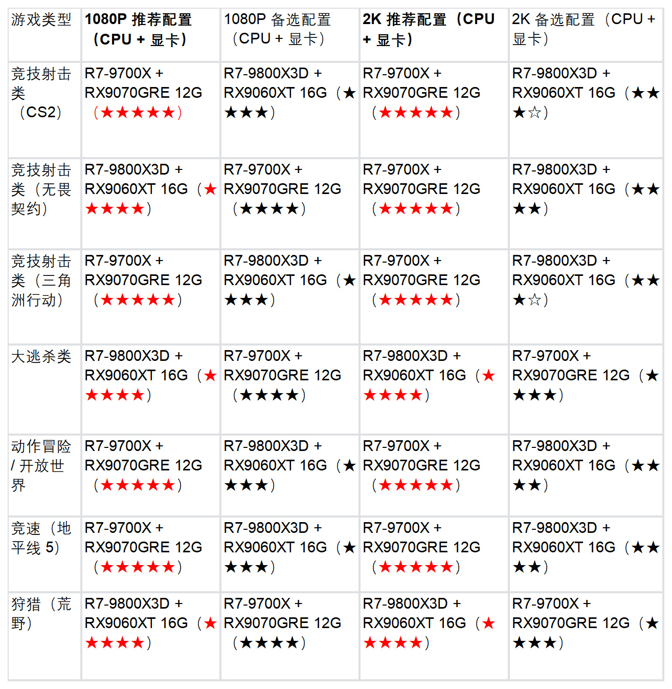 推荐配置:AMD R7-9700X + RX9070GRE 12G