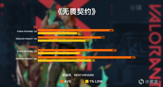 《无畏契约》1080P 高画质下,9800x3d+9060xt CPU 与显卡的搭配带来超高的平均帧和 1% 低帧,让 “技能释放”“近距离刚枪” 时画面极度流畅,操作跟手性拉满,是竞技玩家的理想选择。另一套配置虽双帧数据落后于推荐配置,但该套 CPU 与显卡已能满足流畅游戏的基本需求,适合休闲竞技玩家。