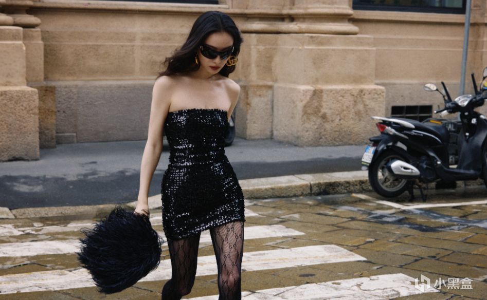 这次倪妮穿的是 GUCCI 新任创意总监 Demna 推出的首个系列 ——La Famiglia 系列黑色亮片抹胸短裙,裙子上的羽毛装饰很特别,走动时能看出灵动感。她还配了网纹黑丝和金色 GG 耳环,跟常见的黑丝搭配不一样,打破了单一的质感。