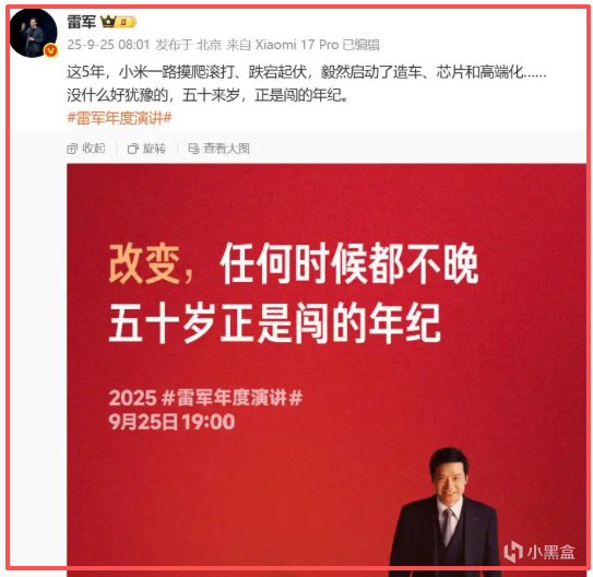 9 月 25 日晚 7 点,小米集团董事长兼 CEO 雷军将开启第 6 次年度演讲,这次演讲主题定为《改变》,他会在演讲里分享小米玄戒芯片和小米汽车背后的故事。
