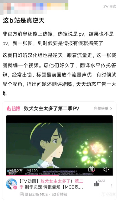 甚至一些“舅舅黨”暴露的消息,還沒有被驗證真僞,夏日幻聽就急着讓組員進行翻譯併發布。比如在去年3月份,MCE字幕組僅根據情報師泄露的小道消息,以及一張新圖片,就發佈了《敗犬女主太多了!》的“第二季製作決定”的情報告知。但真正的官方第二季製作消息,直到4月份才正式確認並公佈。