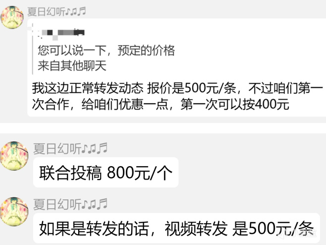 其中最直接具體且盈利能力較強的變現手段,便是字幕組B站賬號的動態轉發廣告。根據卡米亞ゴ提供的“夏日幻聽本人報價”,一條動態廣告的標準價格爲500元。每條廣告獲得的收益,自然都被賬號的主人,也就是夏日幻聽收入囊中。