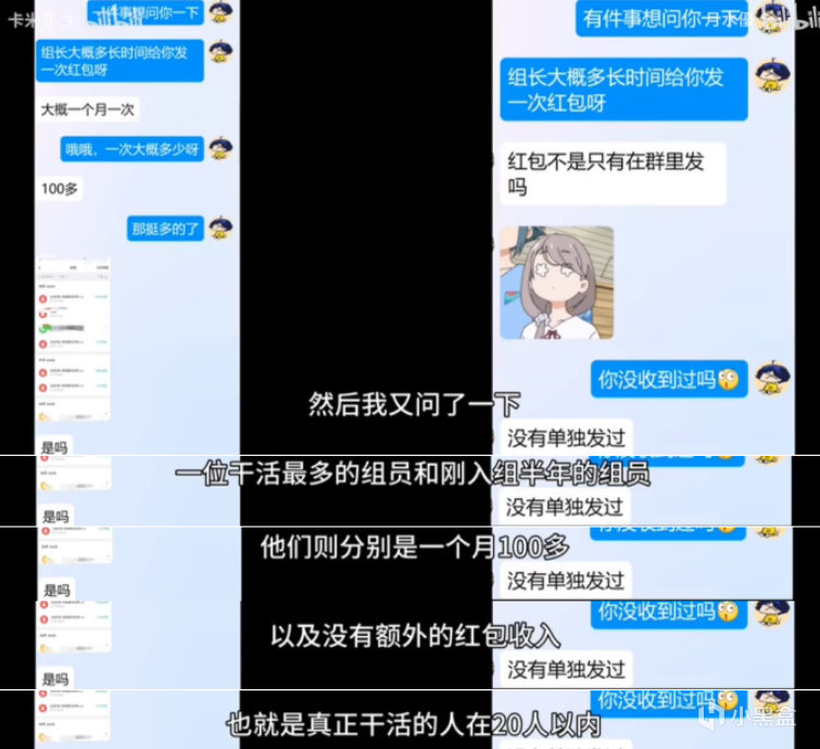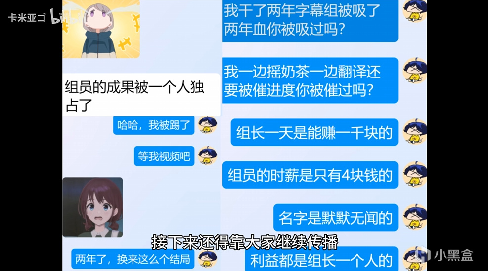 根據組內成員“卡米亞ゴ”發佈的“聲討檄文”,TA在加入字幕組的這兩年內,一直被字幕組組長“夏日幻聽”吸血——自己總計翻譯400條以上視頻,花費超過200小時的時間,卻只拿到約計780元的“工資”。除上工作時長後,卡米亞ゴ的“時薪”大約爲4元。
