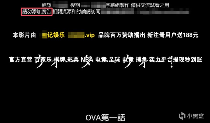 通常來說,此類廣告都是服務器架設在境外的小網站,盜取漢化組的勞動成果後,再私自貼上去的。而爲了應對這種情況,不少漢化組都給自己漢化的片源標註了“禁止添加廣告”的字幕。但這種沒有任何約束力的規定,顯然作用不大,最多隻能爲字幕組自證清白。