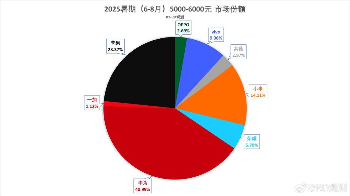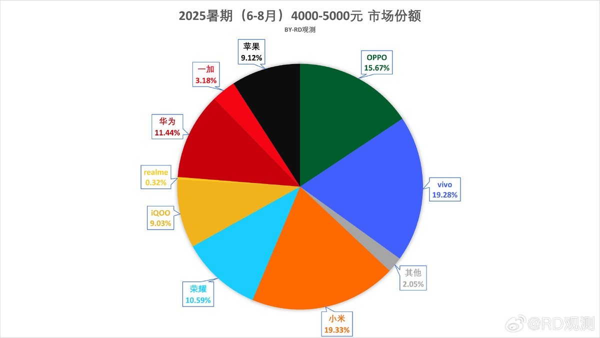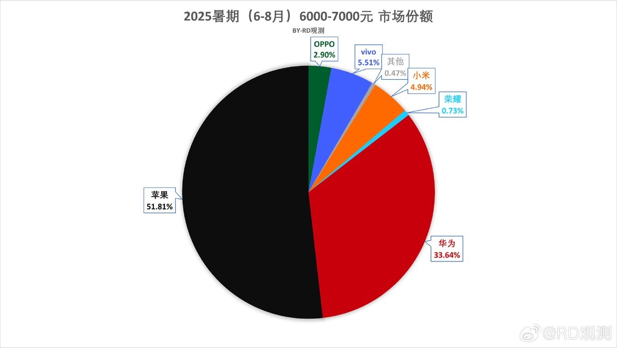 根據博主“RD觀測”提供的數據,2025年暑假8000以上價位段,蘋果以66.26%的市場份額拿下第一,華爲以22.60%的市場份額排名第二,榮耀以3.62%的市場份額排名第三,小米市場份額僅0.23%,遠落後於蘋果華爲,也不如榮耀OPPO和vivo。8000以上價位段,蘋果的領先優勢比較明顯,蘋果市場份額高43.66個百分點,蘋果和華爲市場份額之和接近90%。