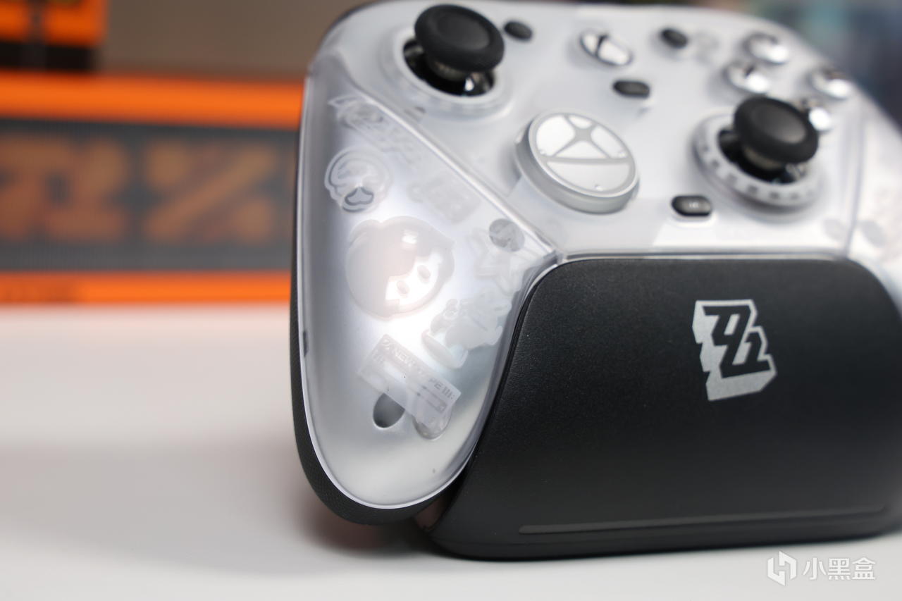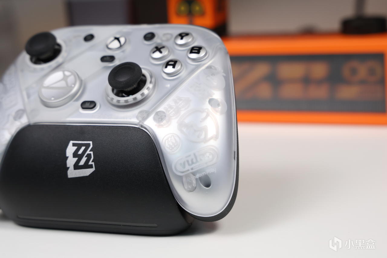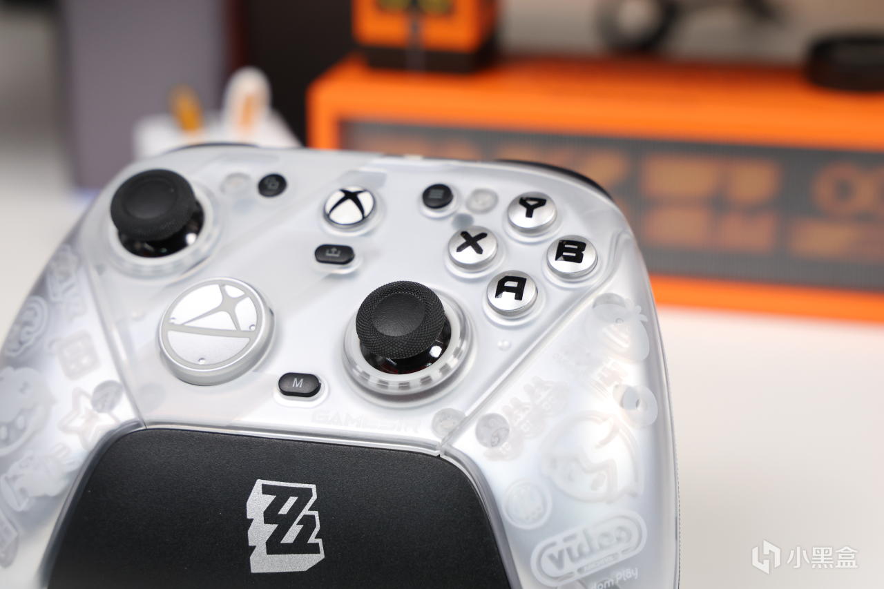 值得一提的是白色的透明面壳拿到手里的第一眼就很特别,面壳握把处带有《绝区零》的元素,摇杆周围也有精致的细节,并且方向键这次也增添了联名的元素,让它特别有辨识度。