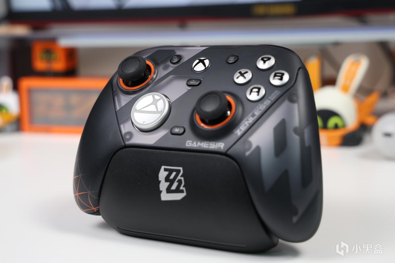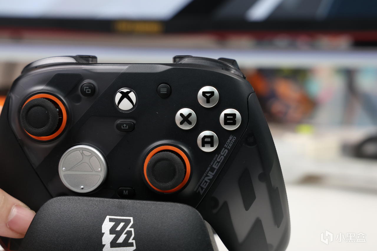 手柄以黑色为主体,搭配上了灰色以及橙色的线条,正面印有“ZWBNLWSS ZONE ZERO”等《绝区零》的相关标识,按键部分,Xbox的标志以及AXBY清晰排列,摇杆旁边是橙色的点缀,左边握把也有橙色网格线,给手柄赋予了活力。