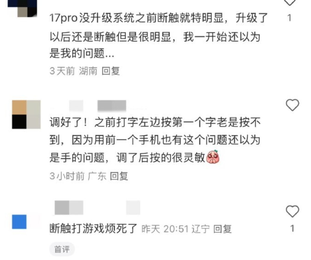 多名用戶在社交平臺反映,新機出現打字漏字母、屏幕邊緣(尤其是側邊)點擊無響應等觸控失靈現象。部分用戶嘗試調整設置仍無法解決,最終選擇退貨。值得注意的是,該問題目前主要集中在標準版機型,Pro系列暫未大規模出現類似反饋。蘋果客服回應稱,斷觸問題“可能與系統運行以及按鈕硬件有關”,並強調所有設備均享有退換貨政策,承諾對質量問題“負責到底”。業內分析指出,原因或與標準版採用的超窄邊框設計(左右邊框僅1.44mm)及其觸控模組硬件品控有關。