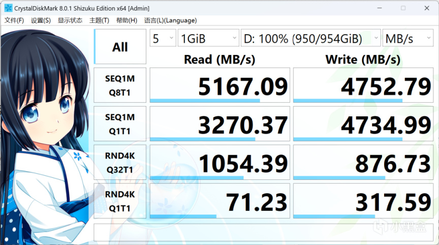 連續讀取5167MB/s,連續寫入4752M/s,4K讀取71MB/s 4K寫入317MB/s。