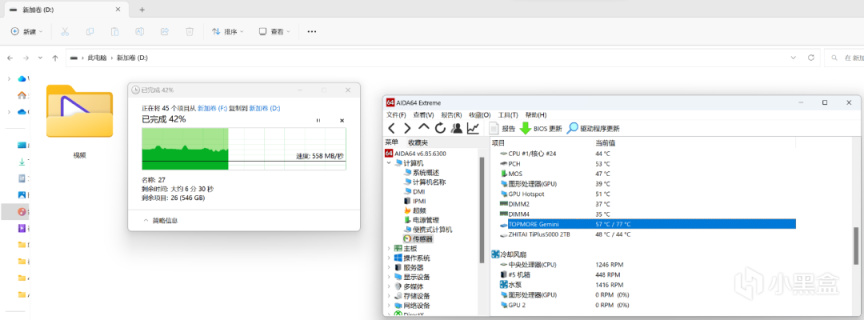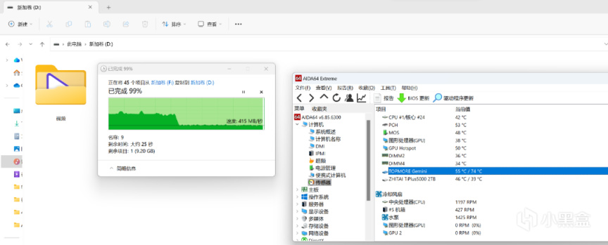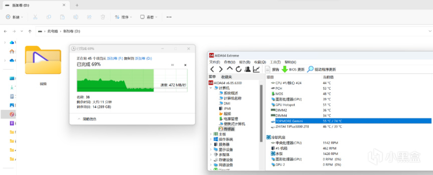 全盤寫入時,AIDA64軟顯,顆粒最高57度左右,主控最高77度左右,溫度不算低(可以考慮使用更好的散熱片,比如說用主板自帶的M2散熱厚裝甲)