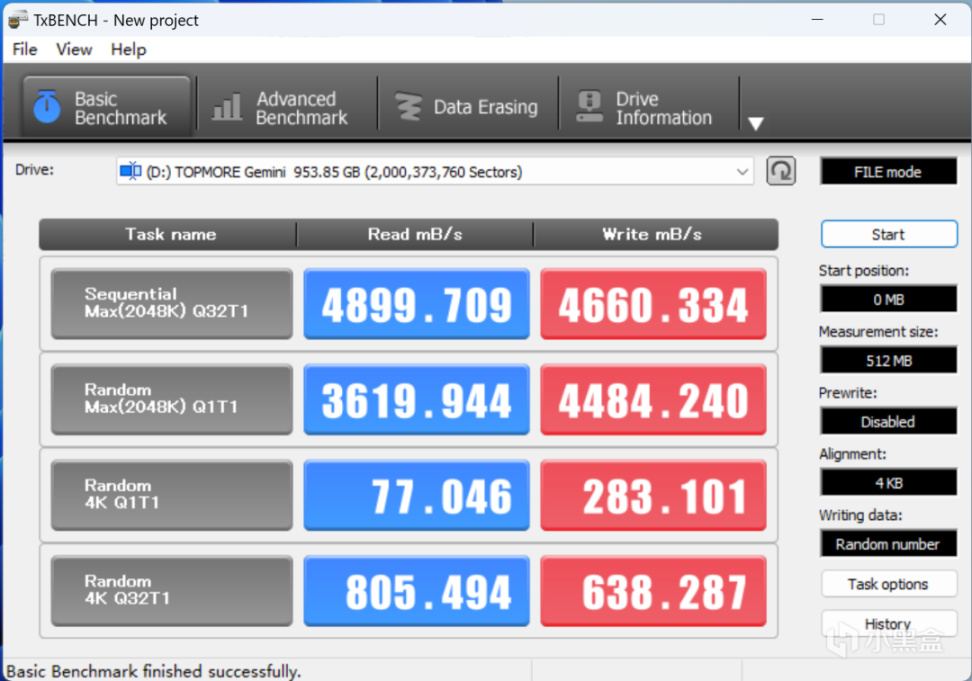 連續讀取4865MB/s,連續寫入4657M/s,4K讀取79MB/s 4K寫入282MB/s。