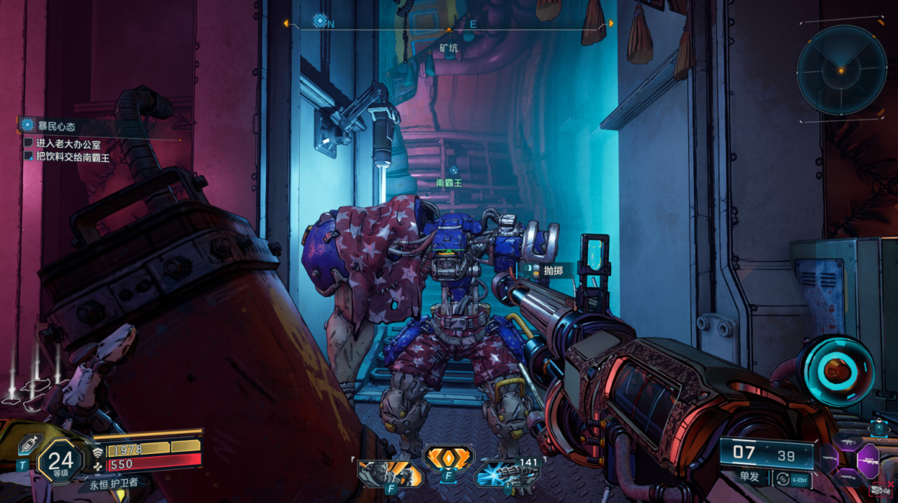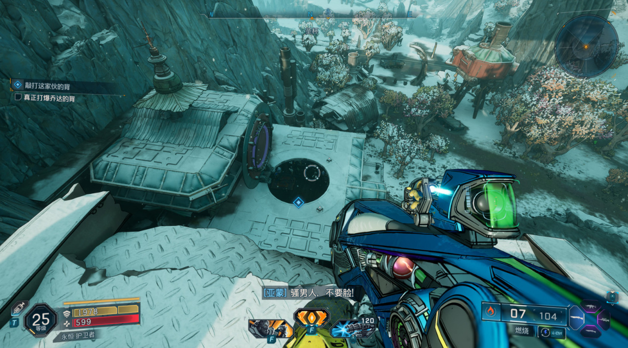 另一方面,本作的地圖演進,也不止限於廣度增長帶來的長途奔襲而已。爲了強化上一作就非常欠缺的開放地圖探索,本作在大部分地圖上散落的收集平處都佈置了垂直方向的探索內容,而在這麼做的同時,又把系列的全息地圖改爲了平面雷達,且標點的距離引導也只包含X和Z軸的距離;這導致在我遊戲初期嘗試做一個完成主義玩家,清空地圖可收集項目時,時常遇到難以尋物的抓狂境地,而後憤而放棄;這個設計思路大概和本代取消小地圖的設計一脈相承,Gearbox居然妄圖在一個渲染風格令人眼花繚亂的開放世界裏,規訓玩家通過視覺辨讀來判斷環境。所以作爲這一部分的結論:不,朋友,一個更稀疏的清單式收集開放世界並不意味着“更好”的開放世界裏罐頭,至少在《無主之地4》這裏不是。