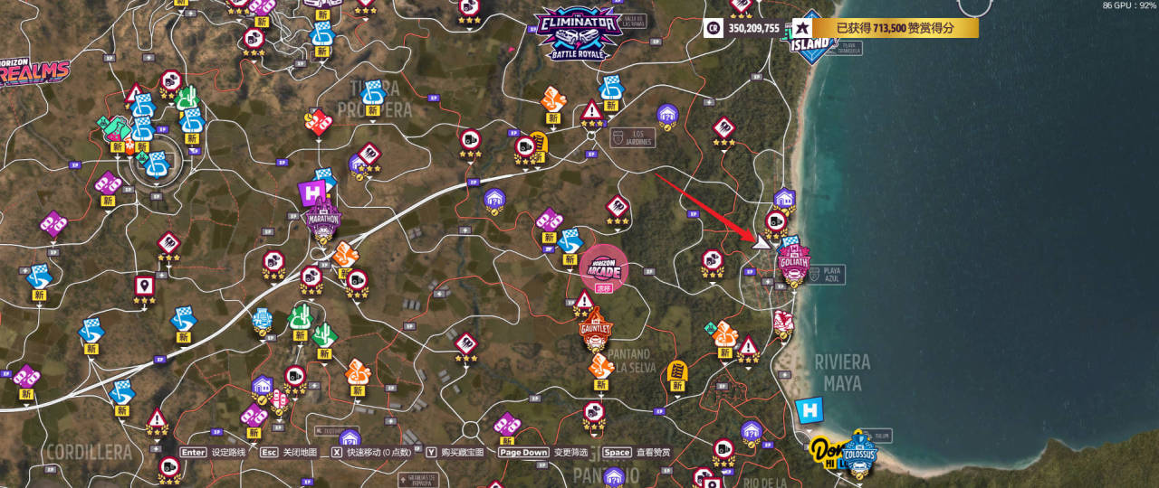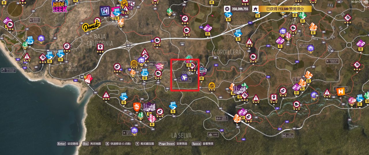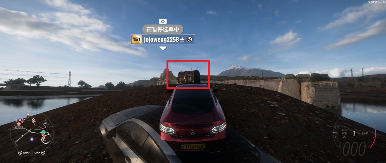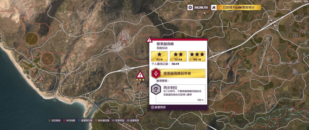 駕駛2016款MERCEDES-AMG C63 S COUPE(原廠就行)在穆萊赫高峯危險標誌達成2星等即可觸發寶箱大致範圍,位置如圖,完成獎勵爲300馬拉松點數