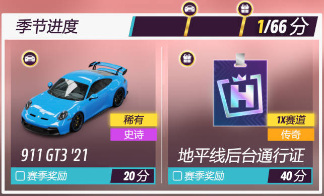 冬季賽20分進度獎勵爲2021款保時捷 911 GT3和40分進度獎勵爲地平線後臺通行證