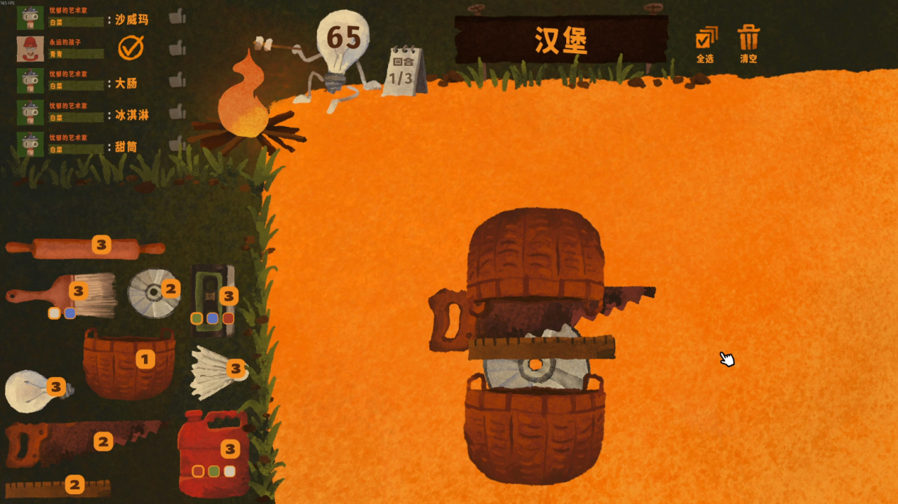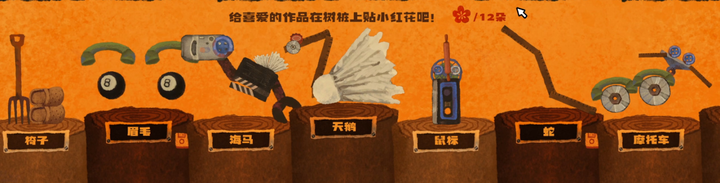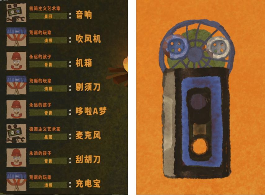 《破烂艺术家》围绕着一方“作画”,多方猜词的模式,只不过游戏干脆抛弃了画笔作画的方式,而是给你一堆生活中那些,有用的没用的道具,诸如雨伞、梳子、灯泡、擀面杖、尺子、菜篮等五花八门的物品,让玩家去拼贴创作。