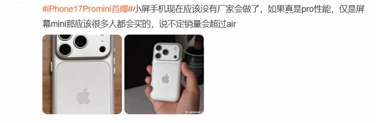近日,關於蘋果曾計劃開發一款超小型旗艦手機“iPhone 17 Pro mini”的消息在網絡上引發熱議,並登上微博熱搜。爆料顯示,這款屏幕尺寸僅爲4.7英寸的手機原型已在開發驗證測試(DVT)階段被取消,部分蘋果工程師甚至評價其設計“看起來很荒謬”。