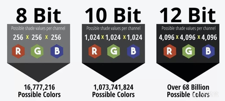 色深分爲8bit、10bit和12bit,雖然8到12的數字看起來差距不大,實際上是量級的差距——8bit是1670萬色,而10bit是10.7億色,一般12bit是專業顯示器,普通人也用不上