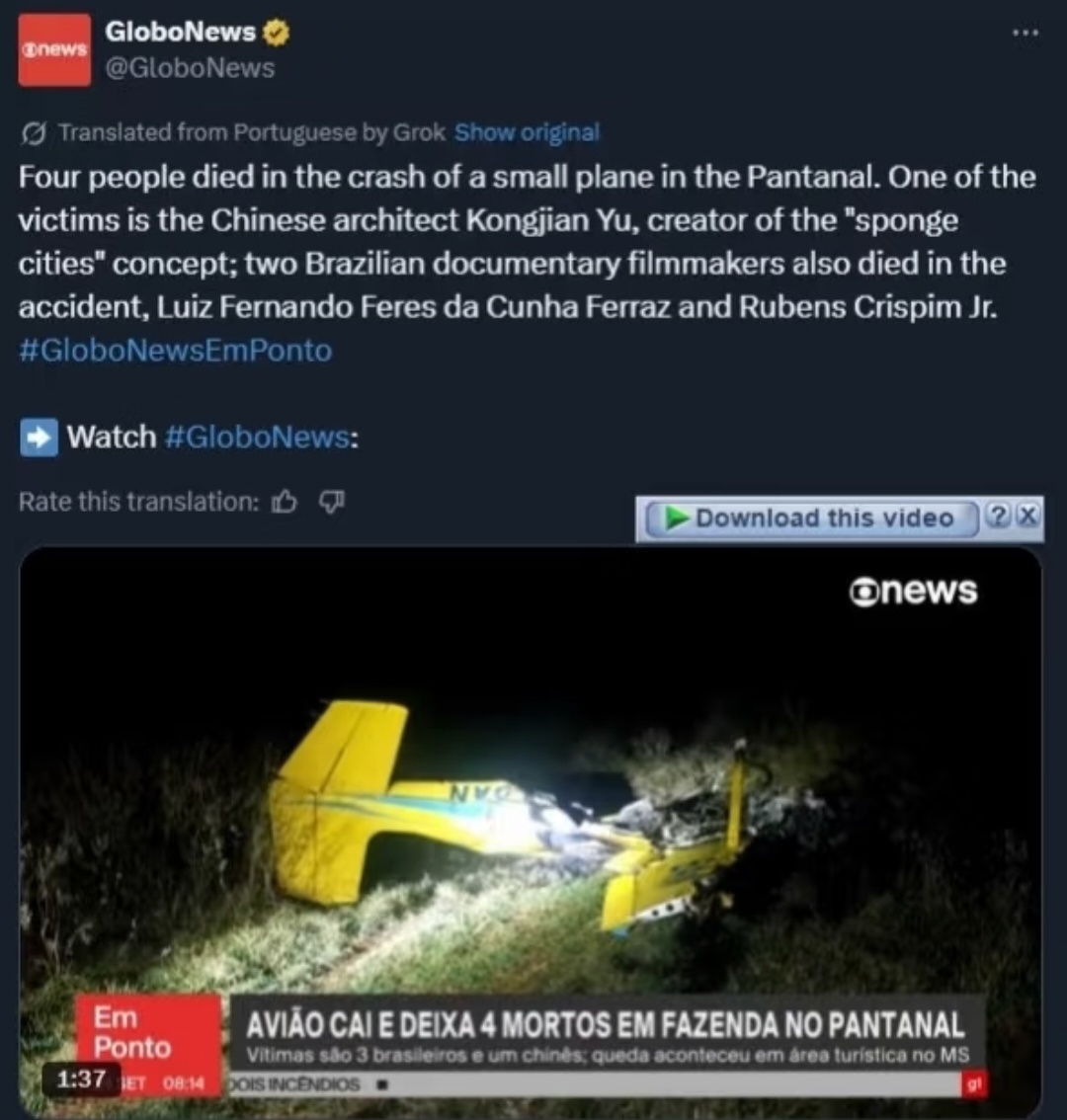 谁也没有想到,这句“探秘才刚刚开始”竟成了他的绝唱。巴西当地时间9月23日深夜,俞孔坚乘坐的小型飞机在潘塔纳尔地区的农场尝试降落时,因不明原因复飞失败,撞击地面后爆炸,包括他在内的四名乘员全部遇难,享年62岁。