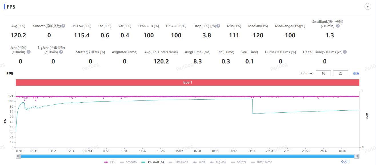 30分钟《王者荣耀》测试结束后,小米17的平均帧率为120.2帧,1%Low帧为115.4帧。