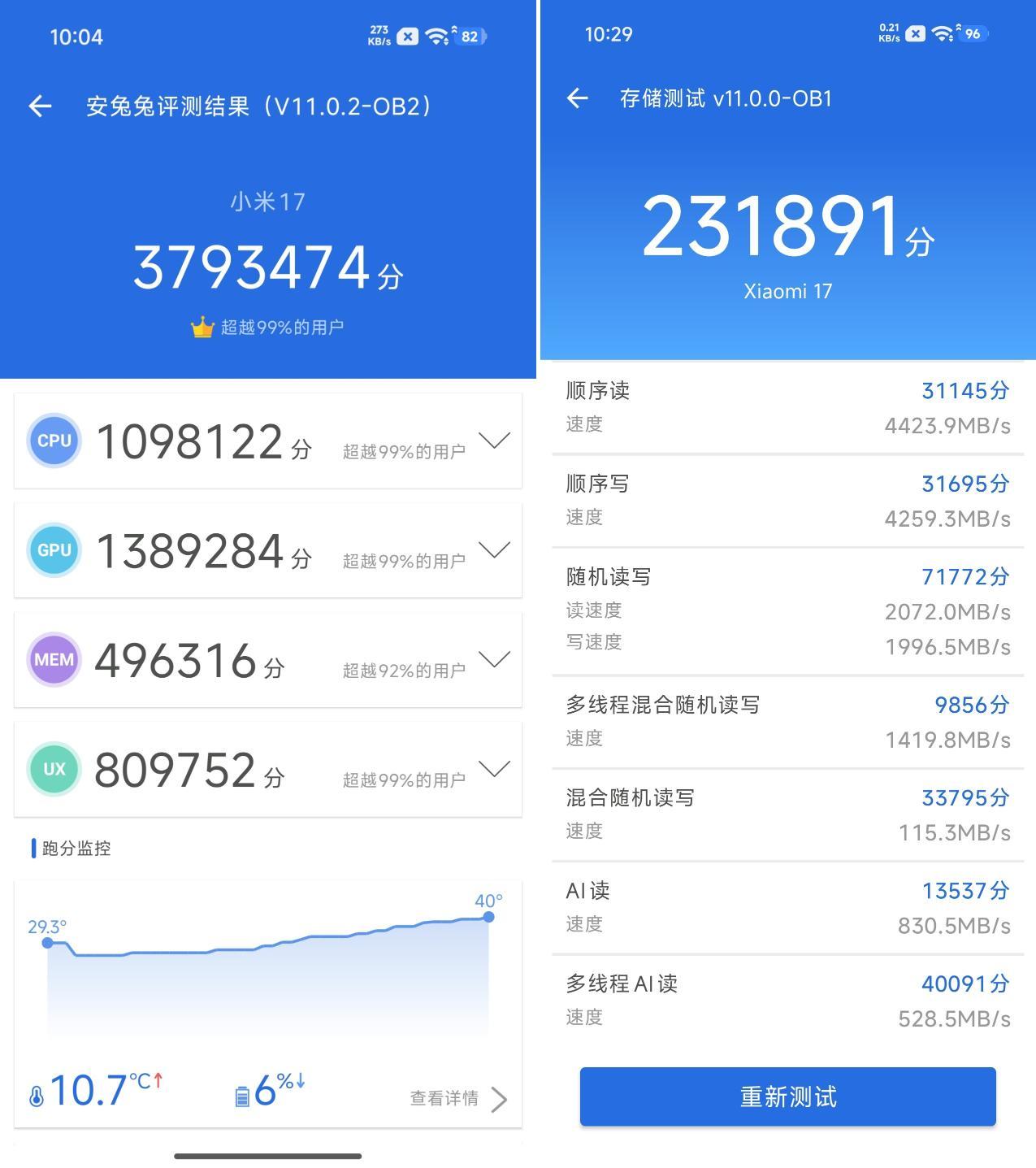 在安兔兔V11版本中,经过多轮跑分测试后,小米17的最优得分为3793474分,其中CPU得分1098122分;GPU得分1389284分;MEM得分496316分;UX得分809752分。