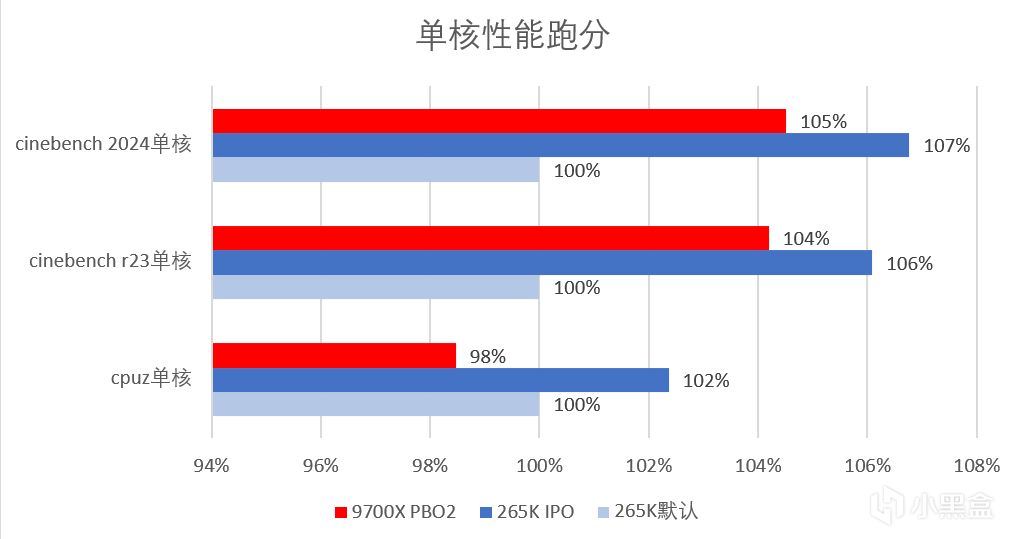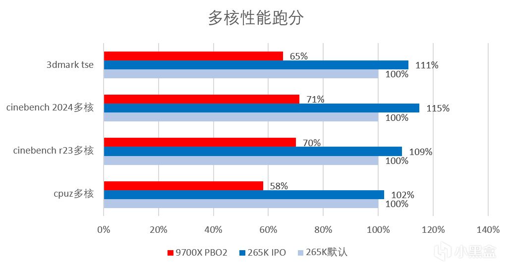 在單核性能下,如果以265K默認設置作爲100%的話,在cinebench r23和2024下,IPO的265K提升都有6%以上,他甚至強於9700X的5%/4%;在CPUZ單核下,PBO2的9700X甚至打不過的默頻的265K,當然我也知道部分97X可以通過定頻定壓拉高單核跑分,但是265K也一樣可以繼續拉高,那這樣就沒有意義了,這裏就還是拿官方提供的便捷超頻工具對比好了。