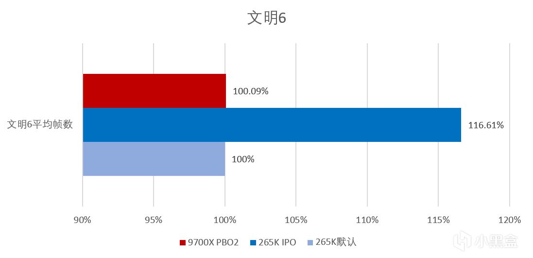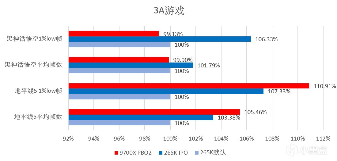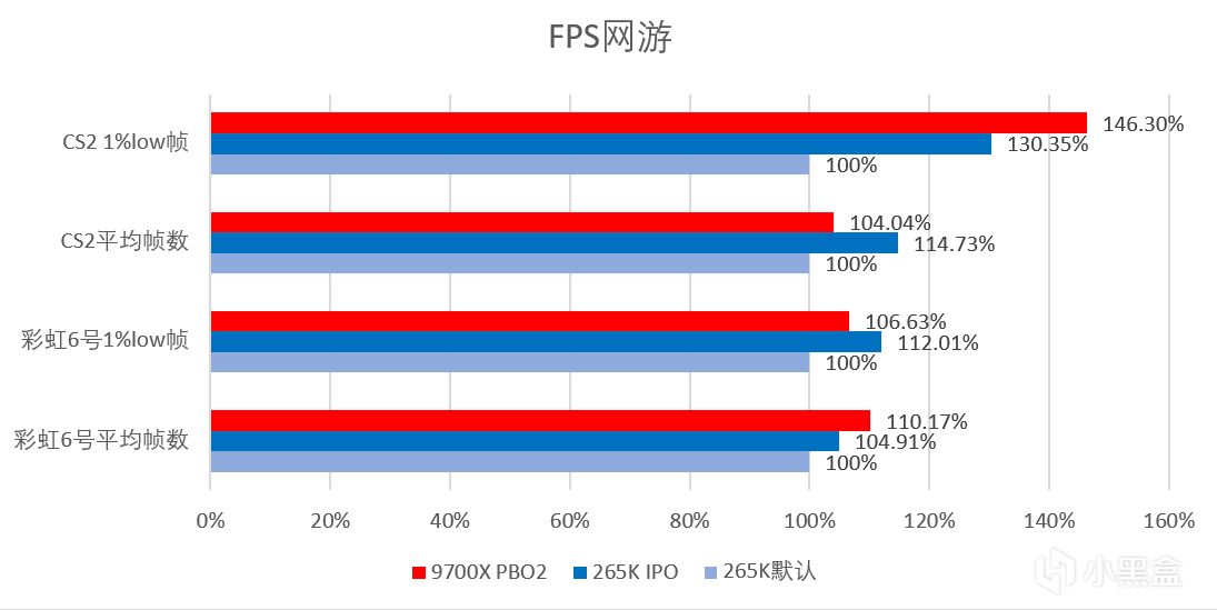 FPS射擊遊戲主要跑的都是自己玩的,對於這類遊戲我在平均幀數差距不大的情況下我會更加關注1%low幀,因爲在幀數足夠的時候,穩定比一切重要,誰想開槍的時候突然卡一下呢。CS2 1%low幀中,9700X的幀數來到了全場最高,相較默認46%的領先,相較IPO後的265K也能有12%的領先。但是在R6 1%low幀中,因爲R6最近更新了新的版本,新版本對大小核支持好像還挺好的,因此IPO後的Intel以112%比率高於9700X的106.6%,但是在平均幀數這裏反而被9700X超過了,這數據我是真有點沒想到。兩邊竟然互有一點勝負。