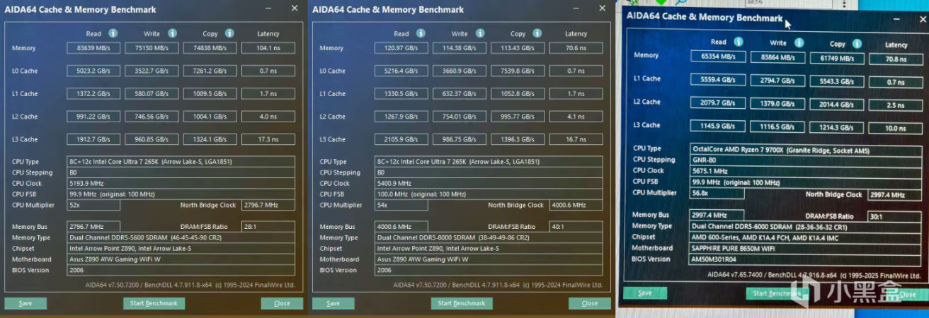 最終設置完成,我們再來看看三者內存延遲,IPO後的Intel和AMD延遲基本差不多,可以看到,默認的265K延遲是真的……如果大家要使用這一代的Intel,強烈建議使用IPO/Ultra200 boost或者自行設置一些超頻選項,這裏的性能提升真的非常大。