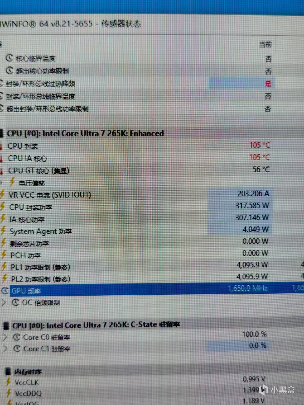 這裏吐槽一點,Ultra200好像在adi64的FPU項目裏面烤雞是有問題的,根據網上衝浪和與大佬的溝通了解,可能是FPU下調用了一些其他烤機用不到的指令集,最終結果就如圖所示了。但是實際如果跑cinebench r23/遊戲等其他測試項目的話也就280W左右的封裝功耗,這個功耗下我的240水冷基本能做到保持CPU核心85度左右。