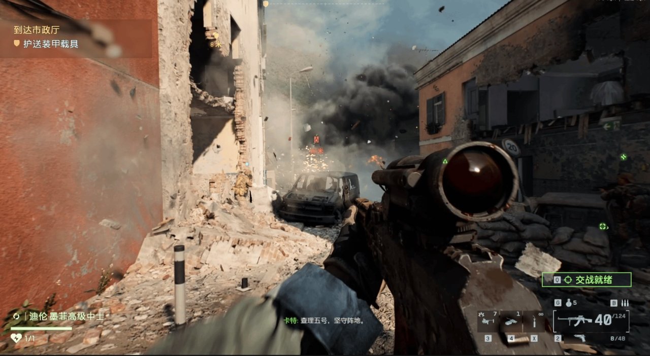 IGN试玩的三个任务充分展示了游戏的多样化体验。“Gladius行动”从激烈的滩头登陆开始,随后转入步坦协同的城市巷战,建筑可被破坏的特性创造了多种战术路线。另一关卡则聚焦于夜间CQB战斗,玩家需利用热成像瞄具和夜视仪在复杂室内环境清剿敌人。而第八章的半开放地图任务赋予玩家极高自由度,作为侦察兵可使用可投放炸弹的无人机自主选择攻击顺序,甚至体验类似“Boss战”的直升机对决环节。