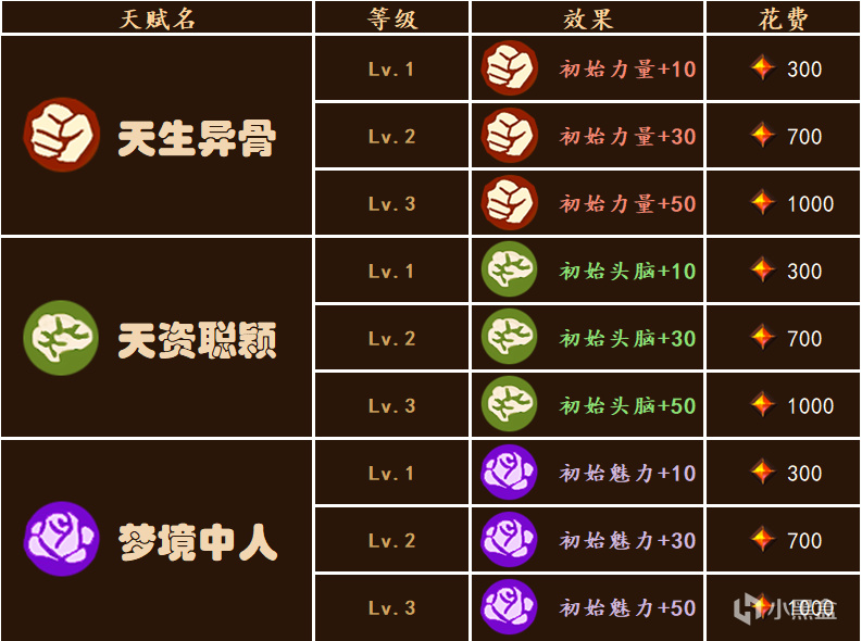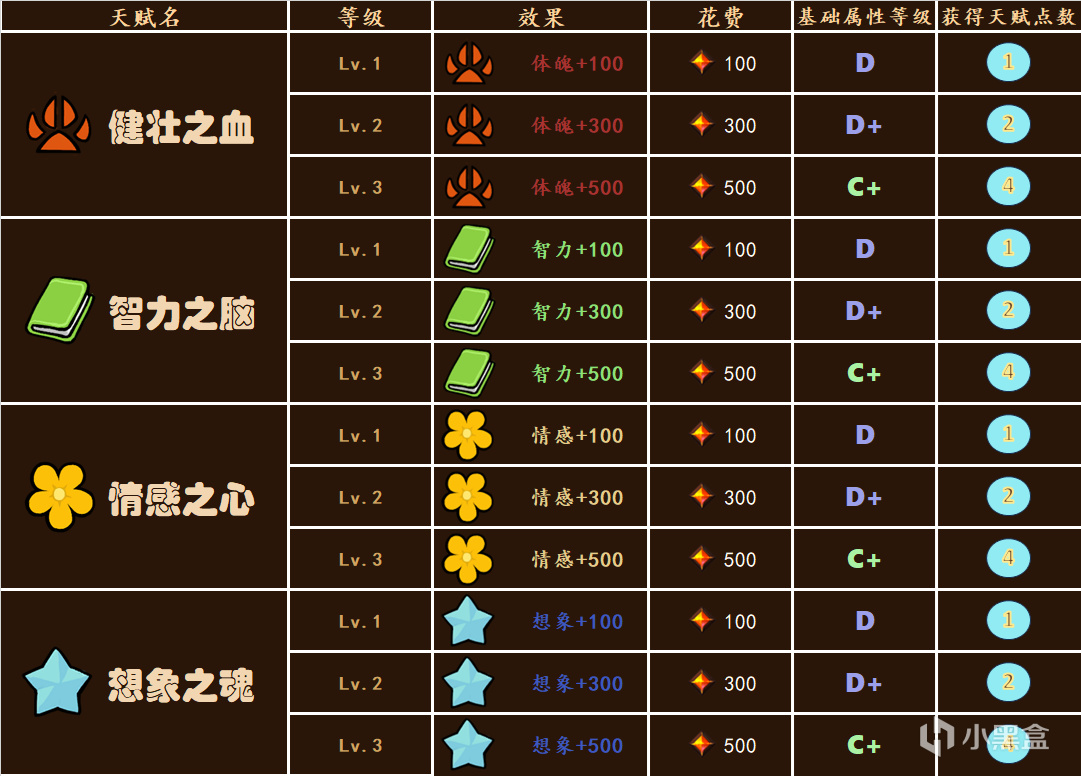 力量50左右、頭腦20左右、魅力10左右;體魄1800左右、智力690左右、情感590左右、想象510左右。