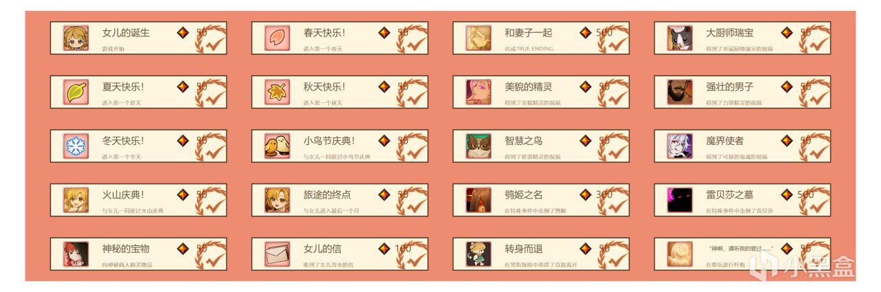 女兒的成長成就共有50個,涉及了遊戲的主要玩法。