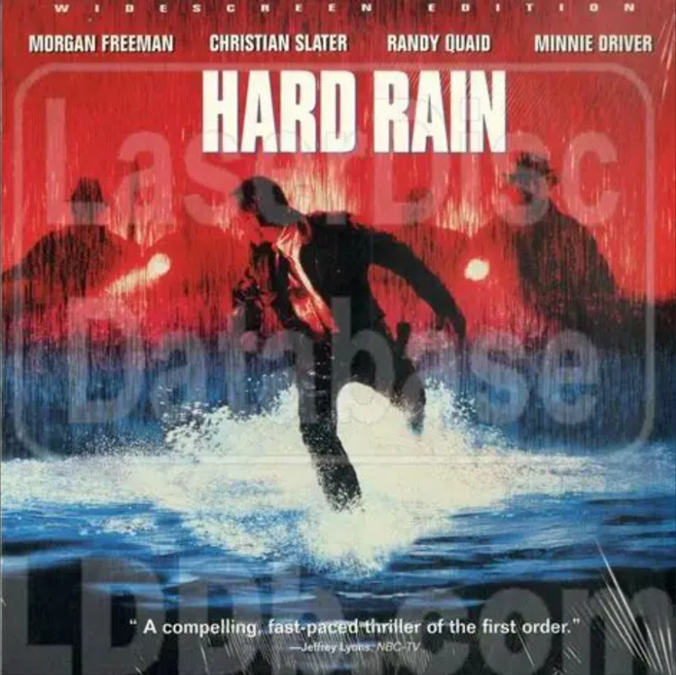 那天,哥们儿拿了张全新的LD影碟,现场开封,我看到了封面的片名是《HARD RAIN》(夺金暴潮、暴雨)由摩根·弗里曼 / 克里斯蒂安·史莱特主演。