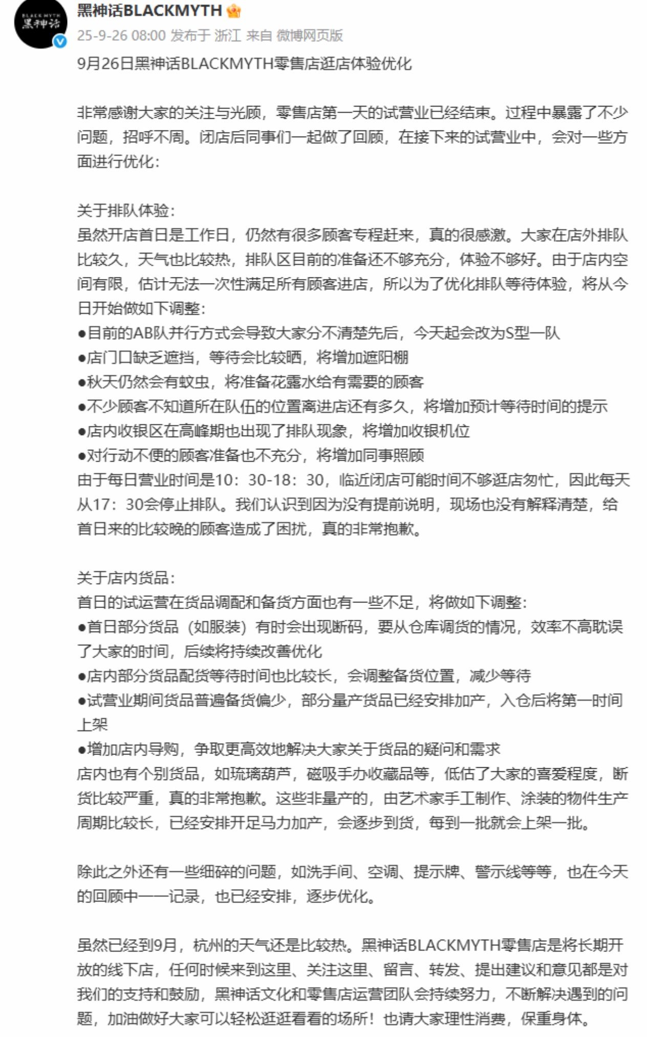 熱門遊戲《黑神話》首家線下零售店在杭州試營業首日便迎來大量顧客,即使工作日仍排起長隊。面對火爆場面,官方在閉店後迅速覆盤,於9月26日通過微博發佈聲明,宣佈多項優化措施,以提升顧客體驗。